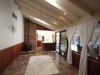 Living room with Regency temperature controlled gas heater, shiny slate floors and handy built in cupboards. Large glass sliding doors overlooking alfresco area.
