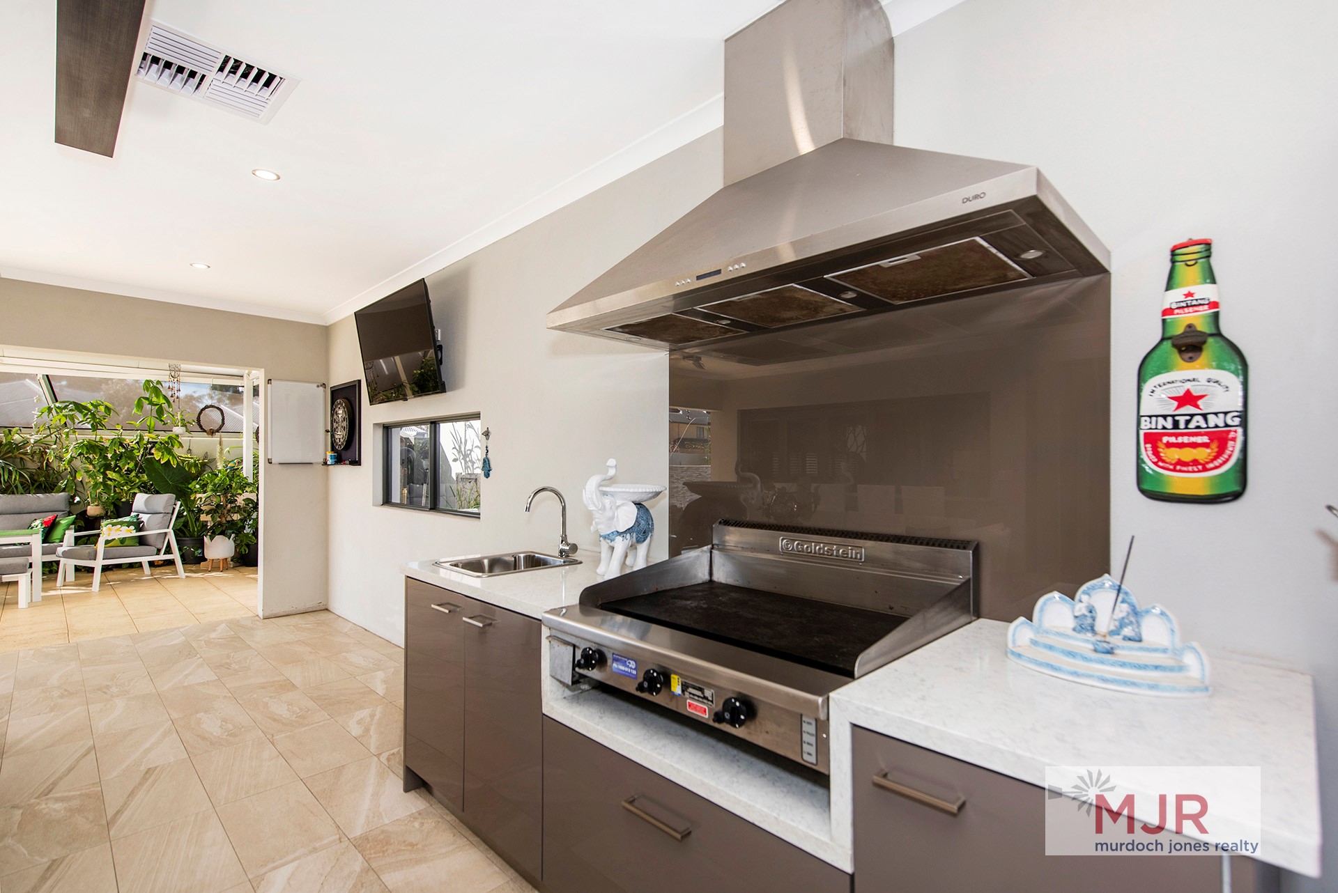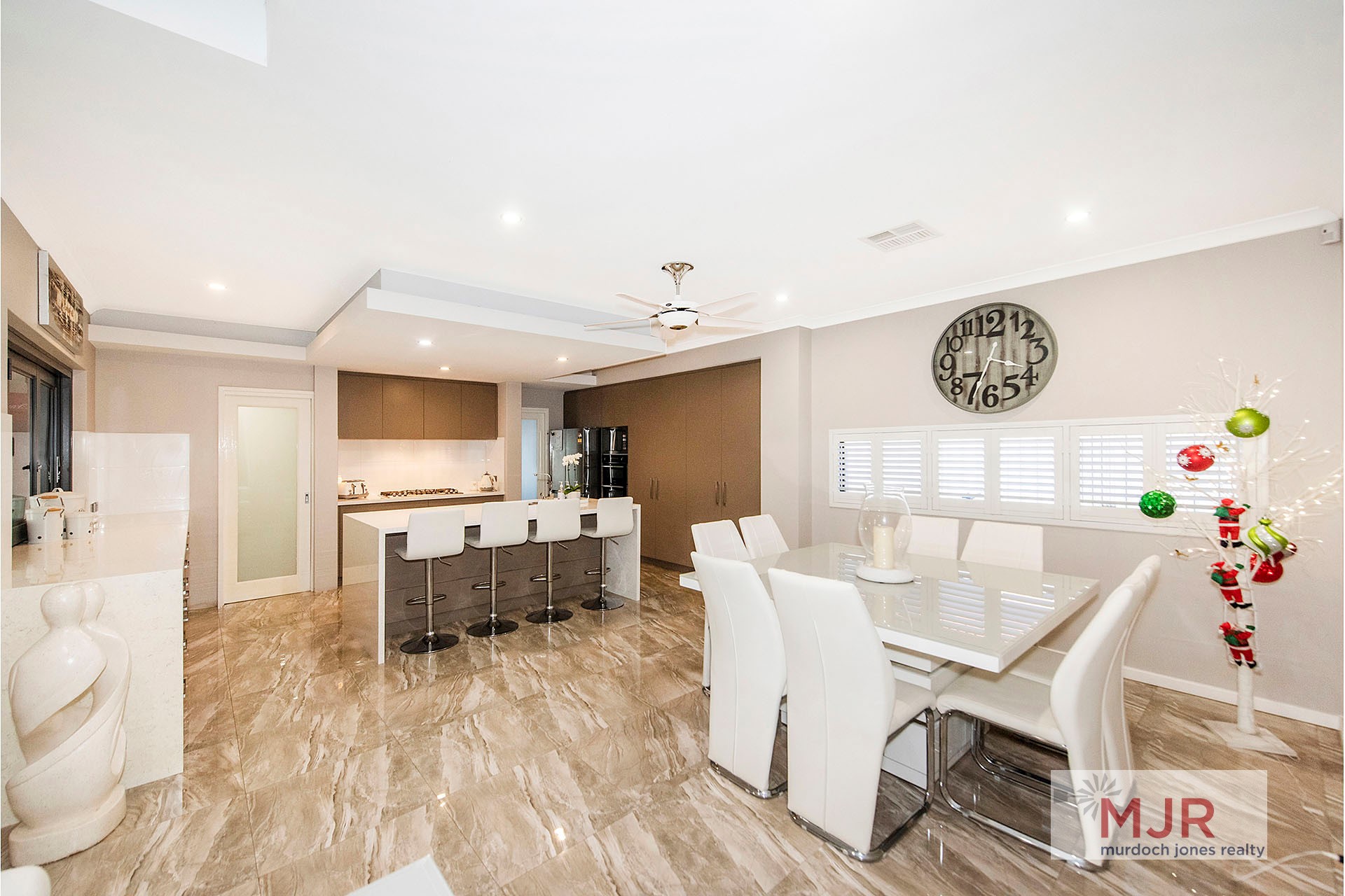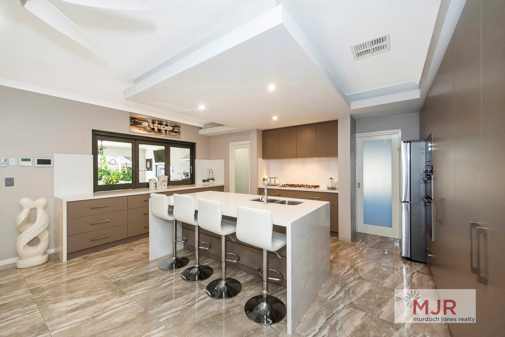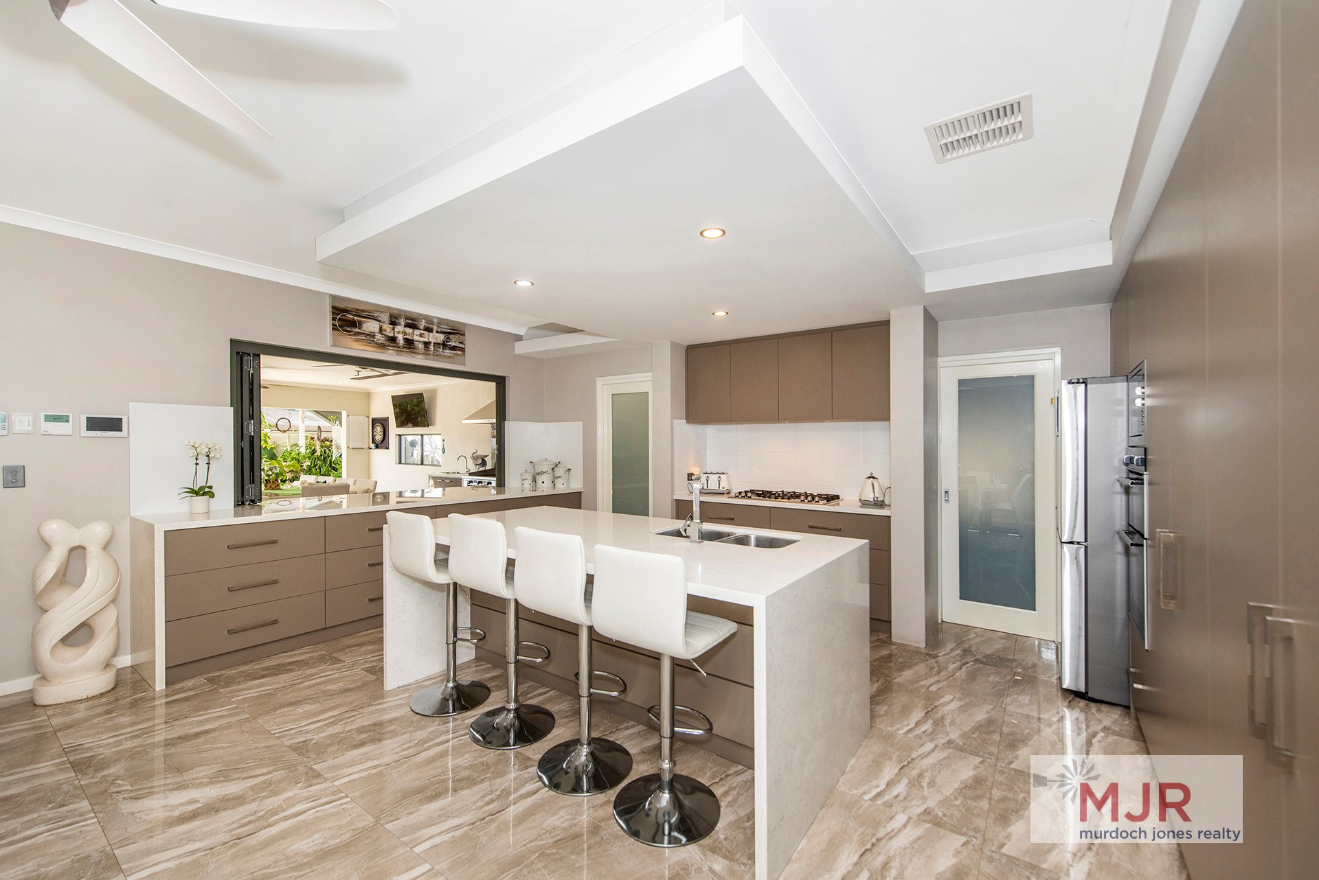 • This certainly has the WOW factor with travertine floor tiles, stone bench tops and quality appliances.