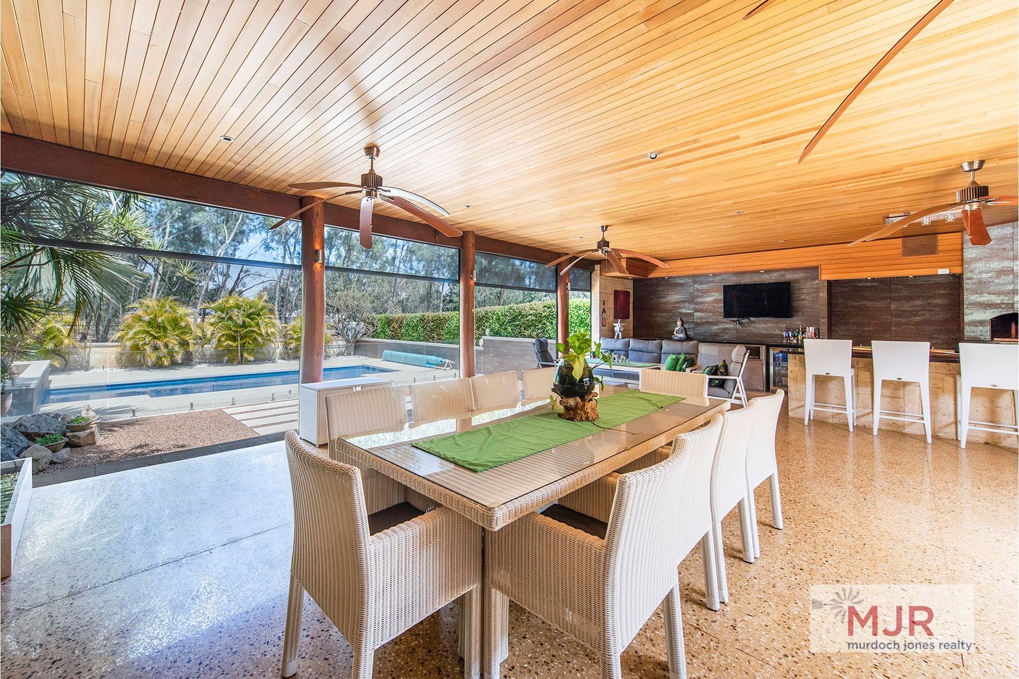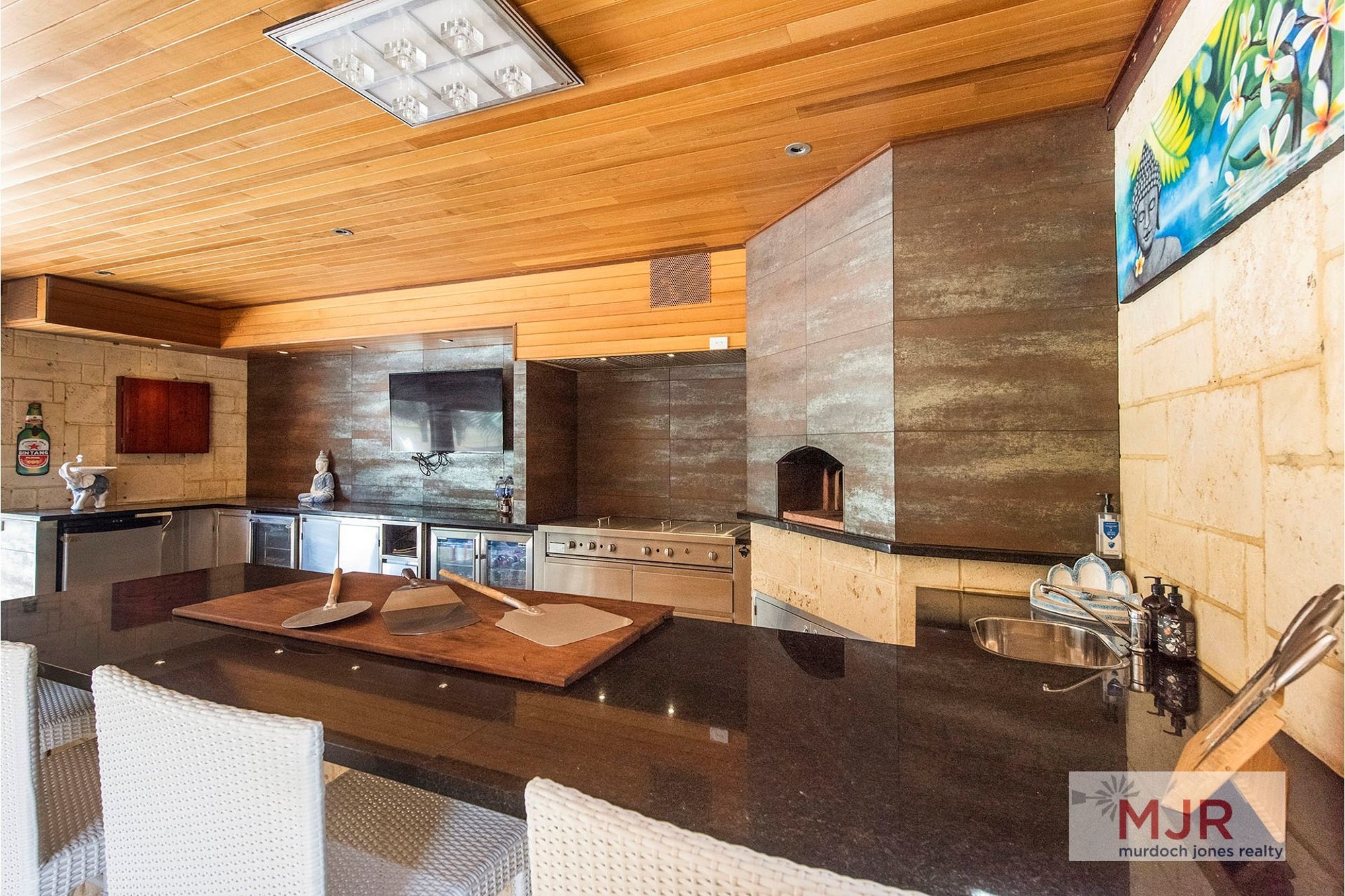 This amazing alfresco area is an entertainer's dream with an outdoor kitchen, pizza oven, timber lined ceilings and polished concrete flooring all overlooking the sparkling below ground pool and spa.