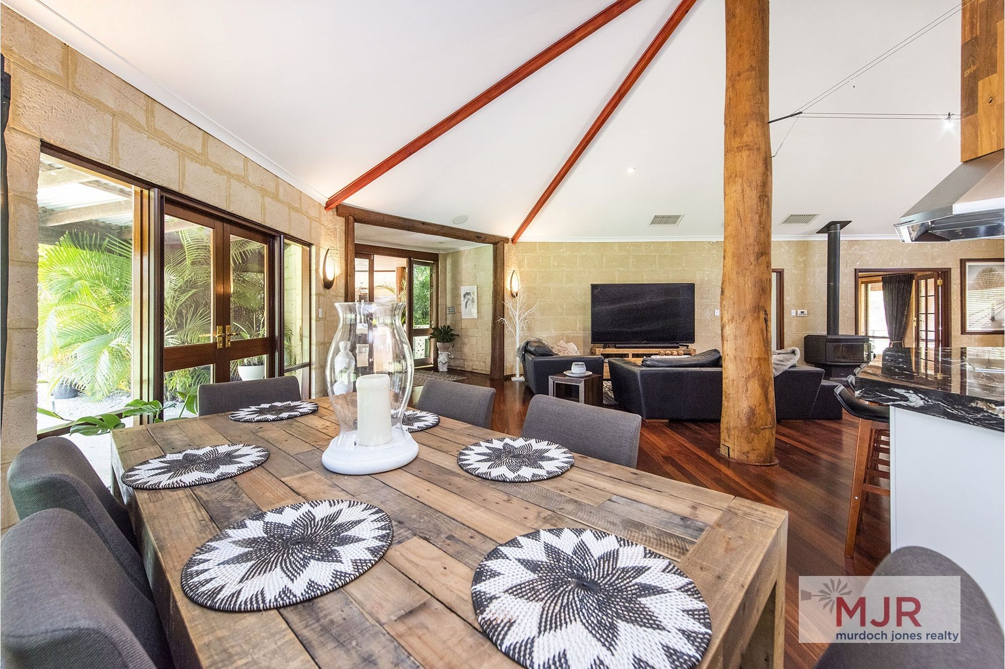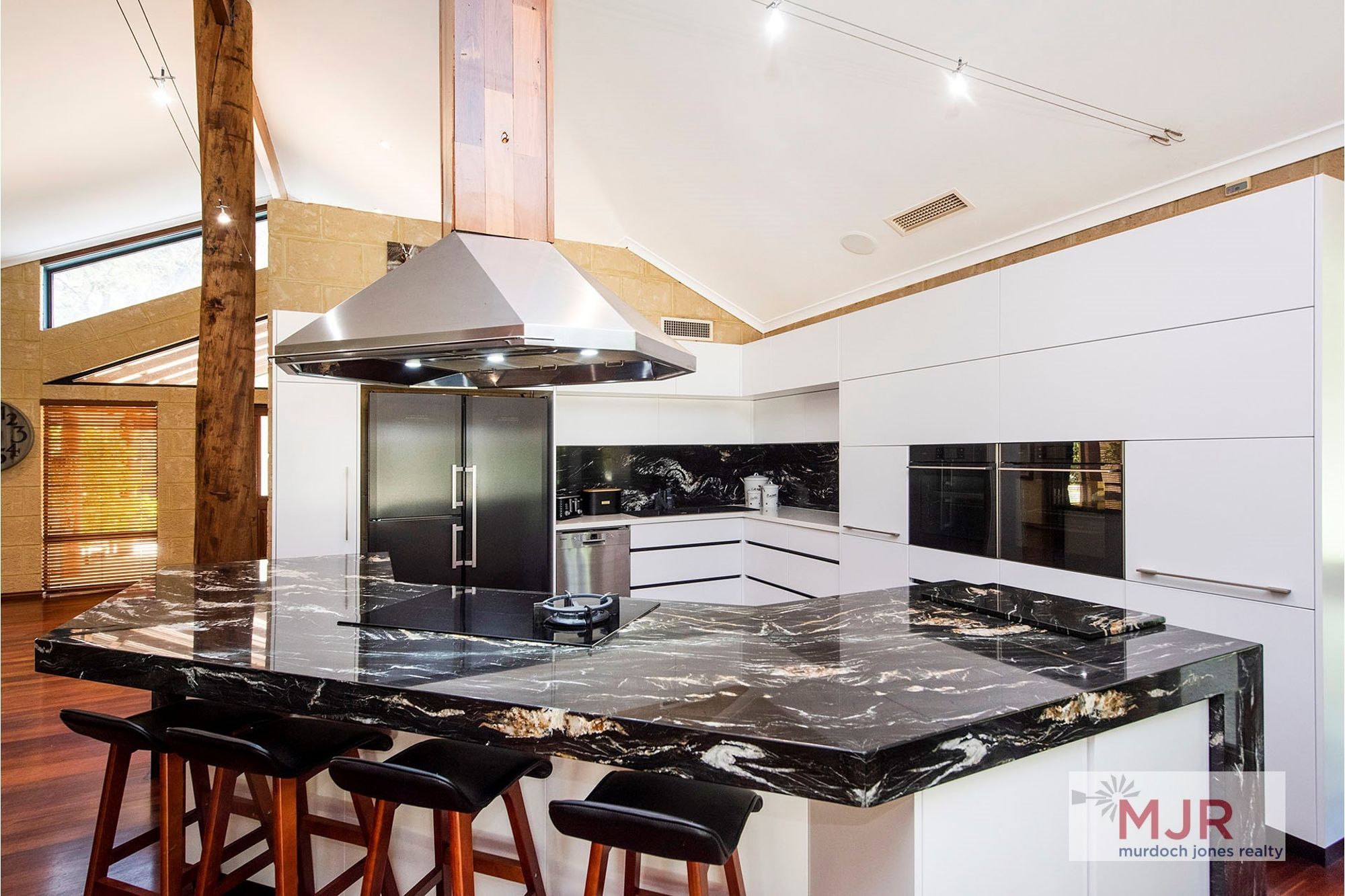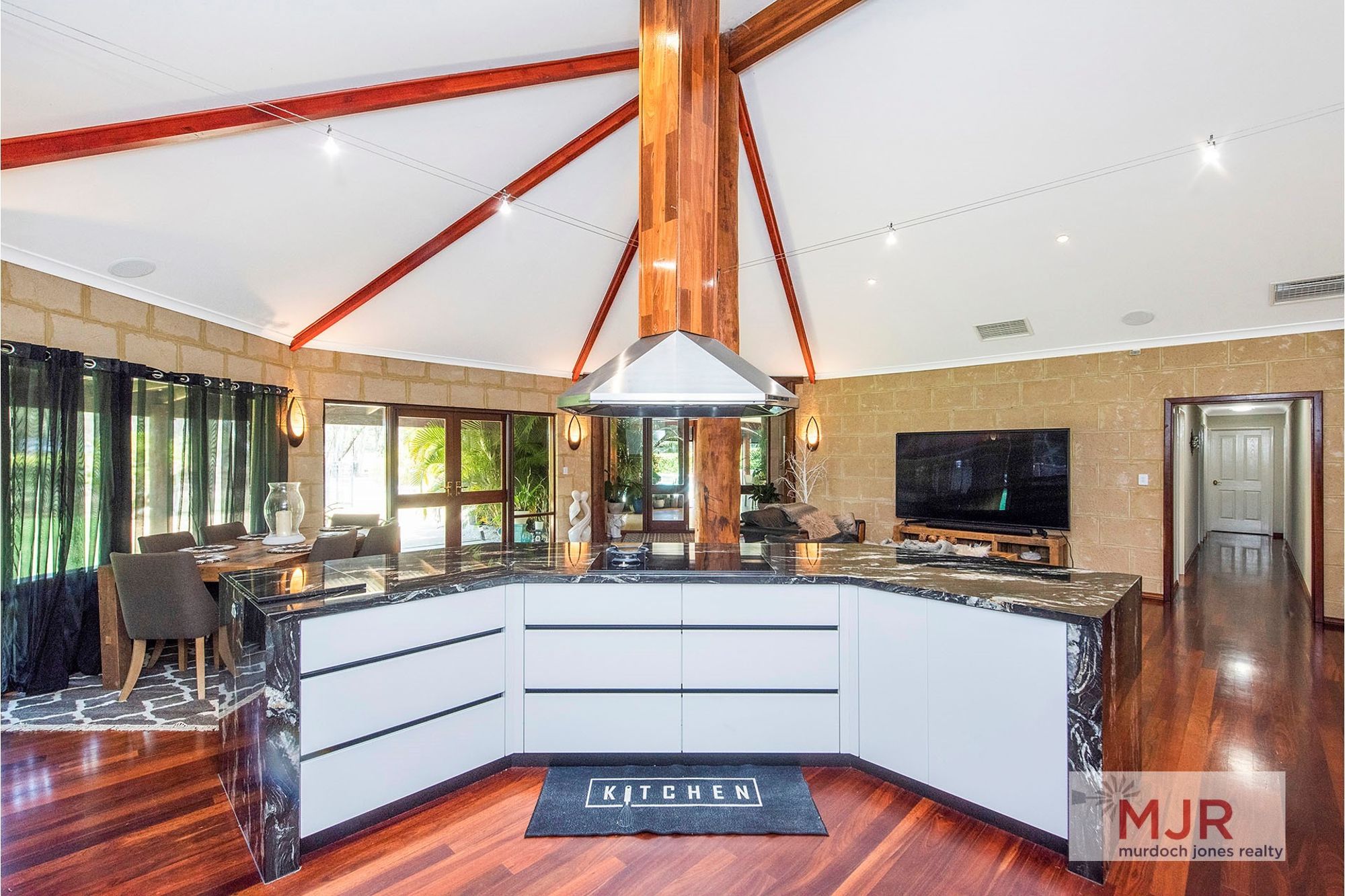 The high vaulted ceilings throughout the kitchen, dining and family areas are complimented by jarrah flooring, giving the area the ultimate WOW factor.