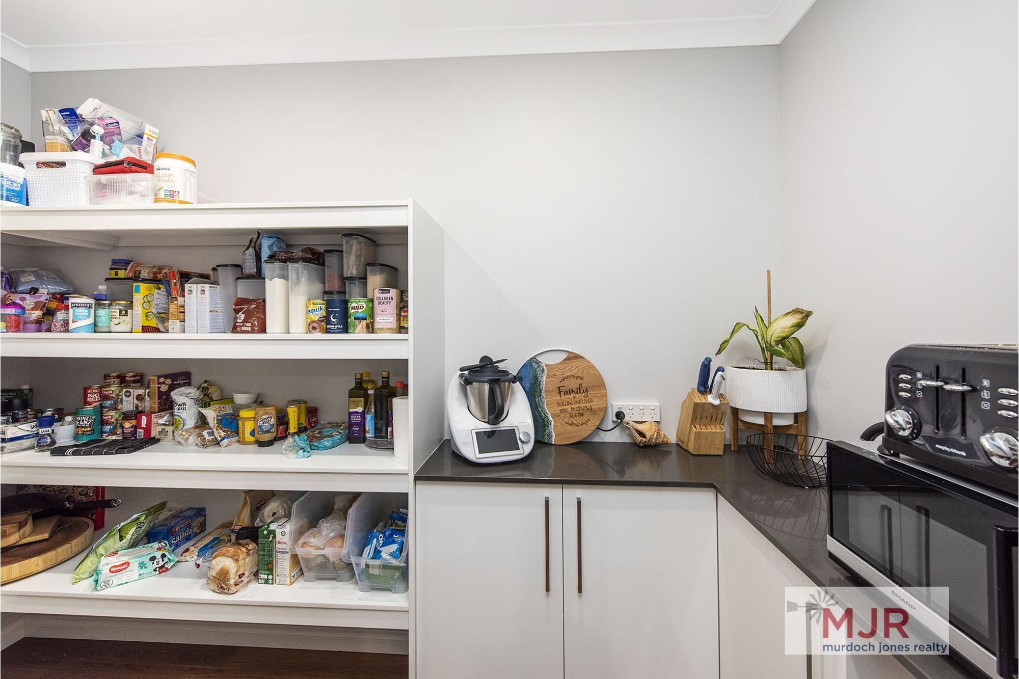 *An amazing kitchen with stone bench tops, splash backs, dishwasher and walk in pantry with scullery