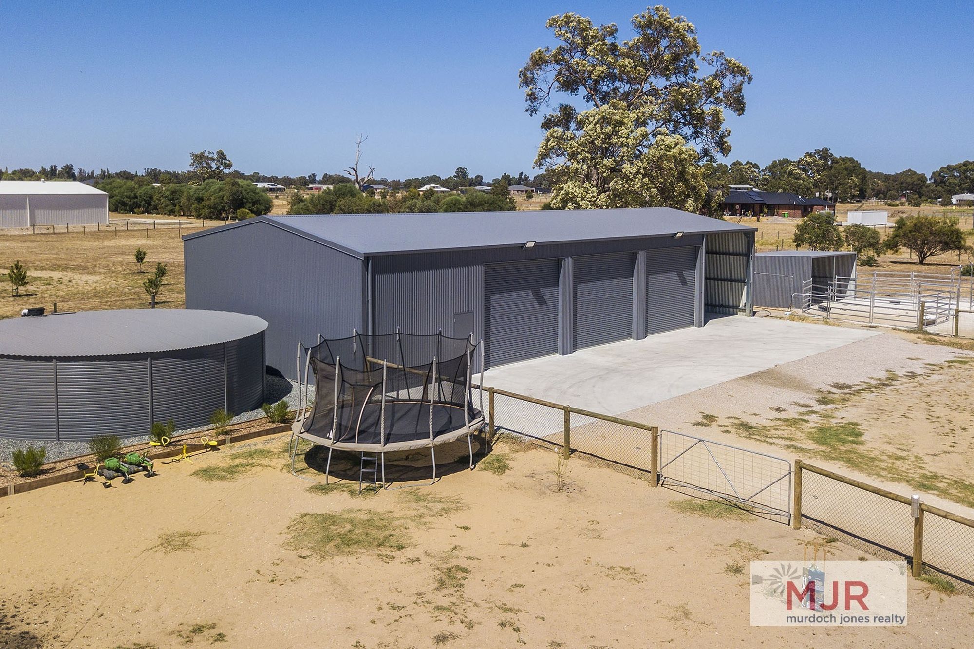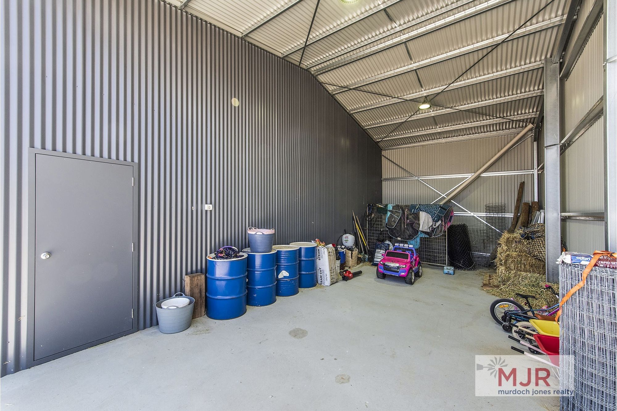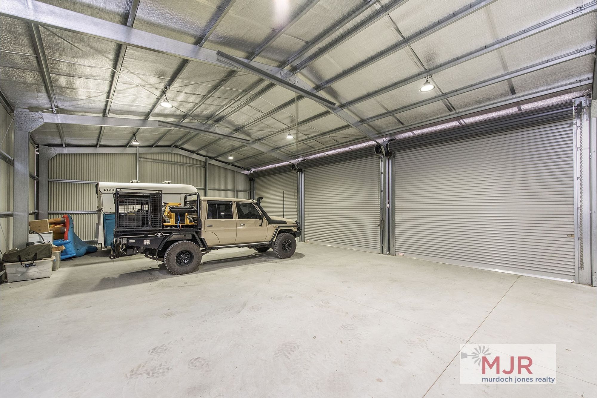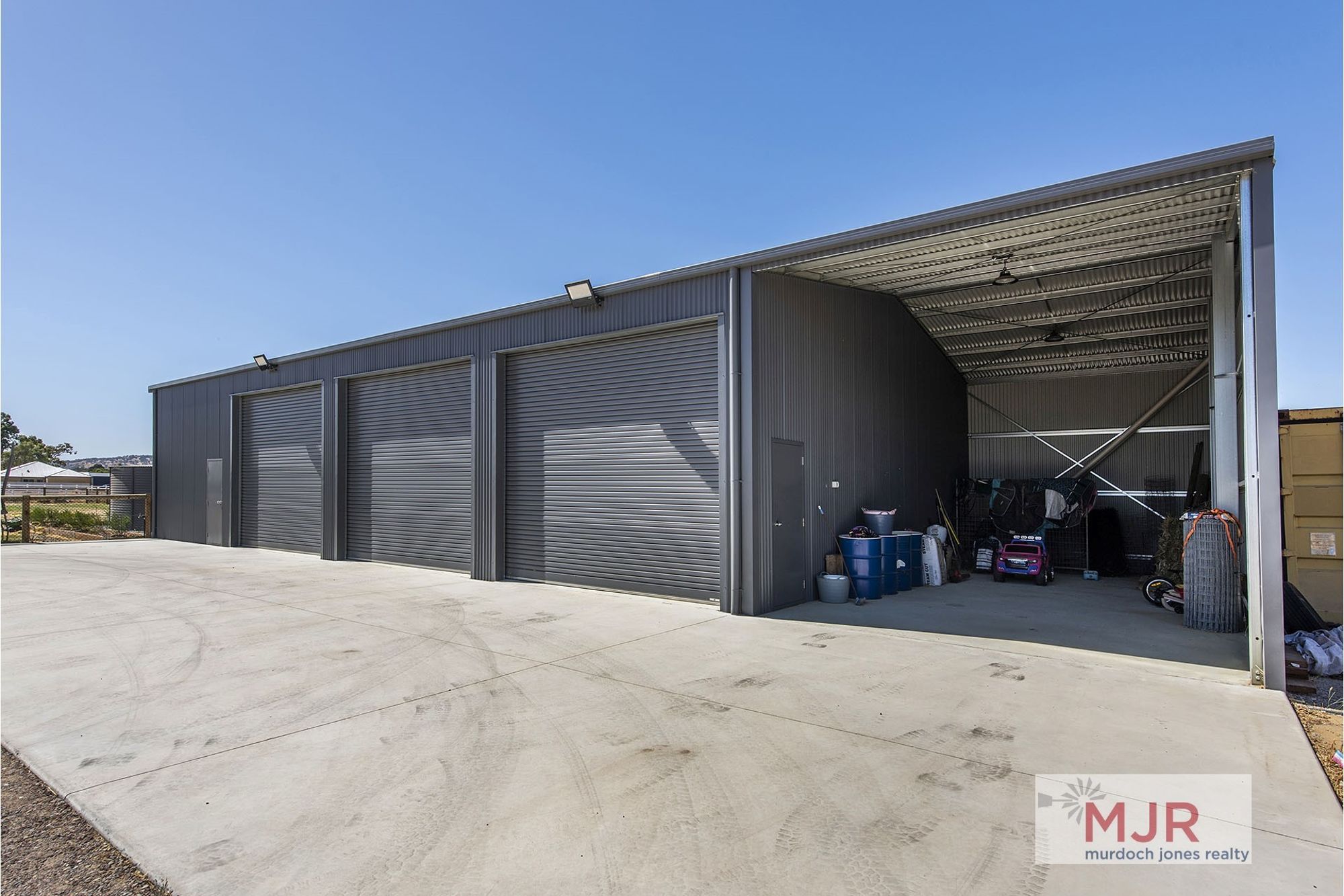 This shed is what every man dreams of having, measuring approx 24m x 10m and equalling 240 sq metres. Includes a concrete floor, lights, 3 phase power and with three approx 4 metre high automatic roller door access.