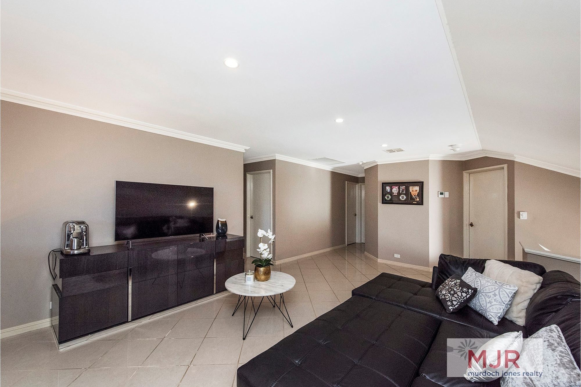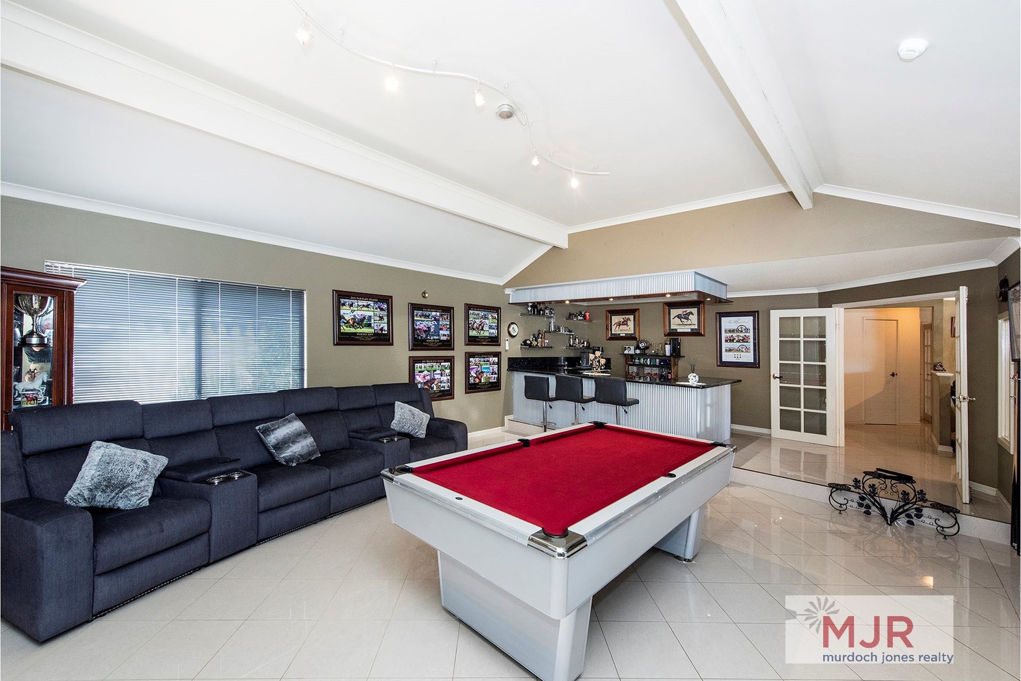 The shiny main bathroom is also located upstairs, along with a separate toilet and a large roomy theatre room.