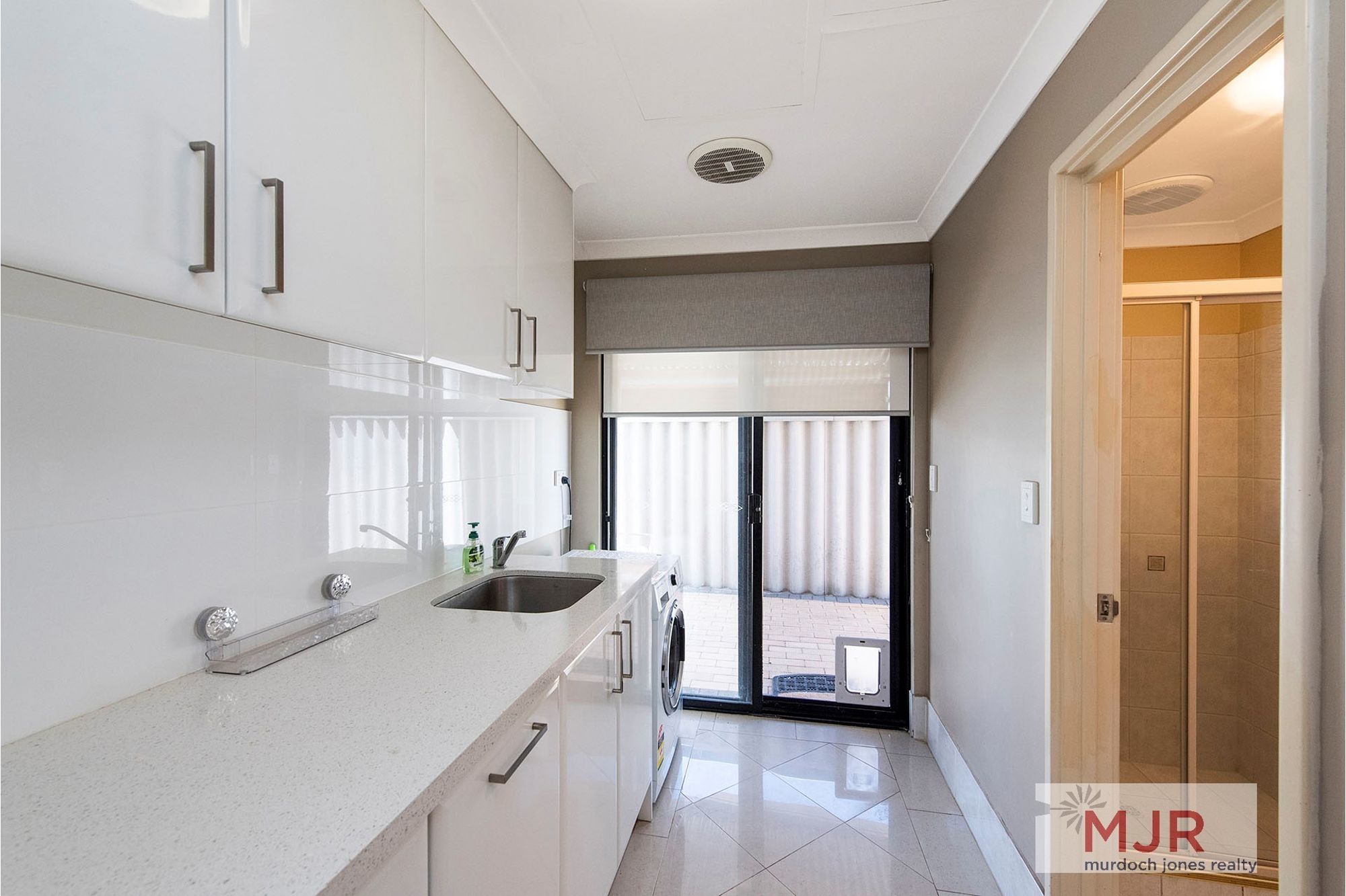 The laundry has extensive cupboards and includes a third shower and toilet.